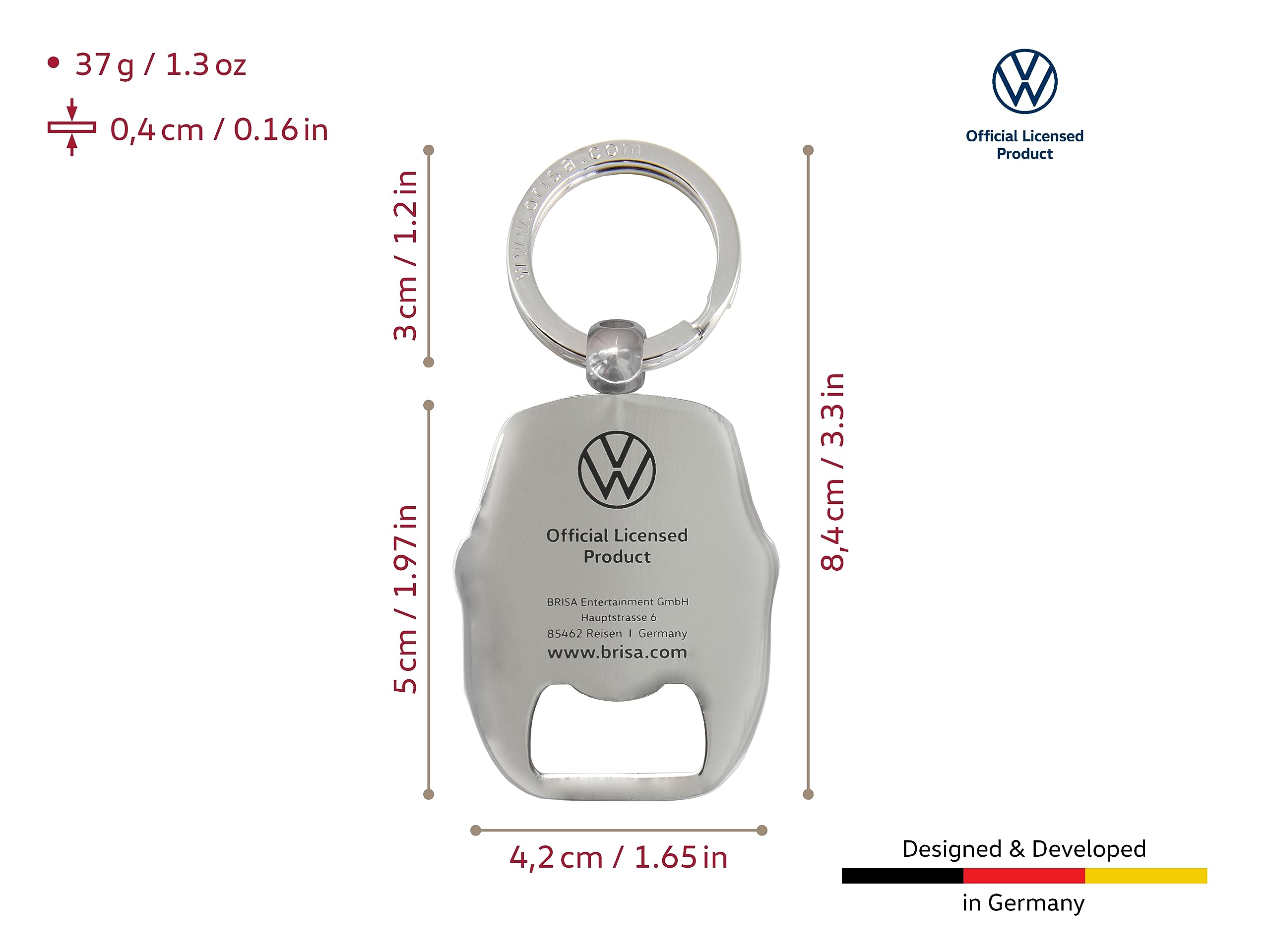 - T1 Bus: This iconic VW T1 Bus keychain with a bottle opener has silver details and the inscription "VW Camper" on the license plate. Dimensions: 4 x 10 x 0.3 cm (1.6 x 3.9 x 0.1 inches).