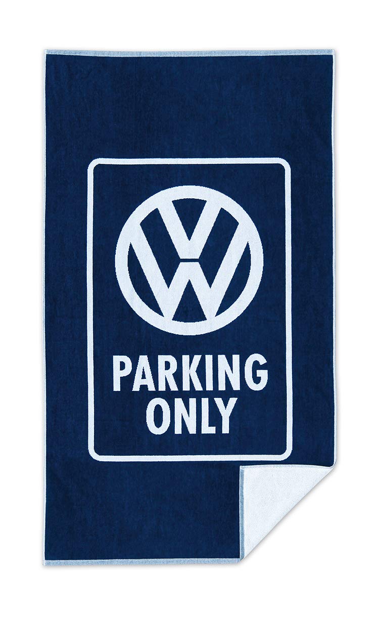 - PARKING ONLY/BLUE: The beach towel is blue and features a white VW logo and the "Volkswagen" lettering. Dimensions: 160 x 90 cm (63 x 35.4 inches). Made in Portugal.