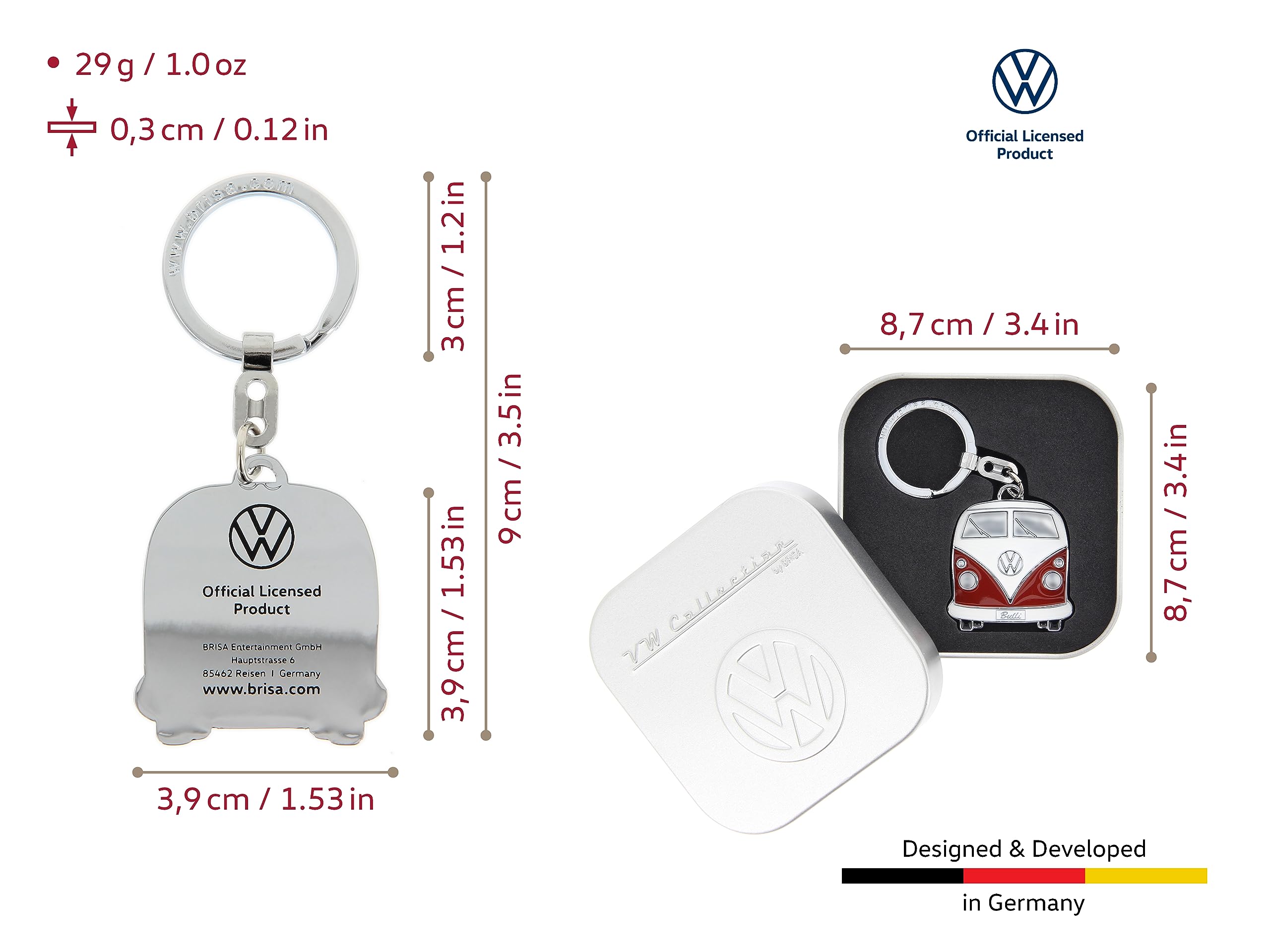 - PRACTICAL DETAILS: The keychain is packaged in an elegant metal box embossed with the historic VW logo. The keychain adorns any keyring and is a stylish accessory.