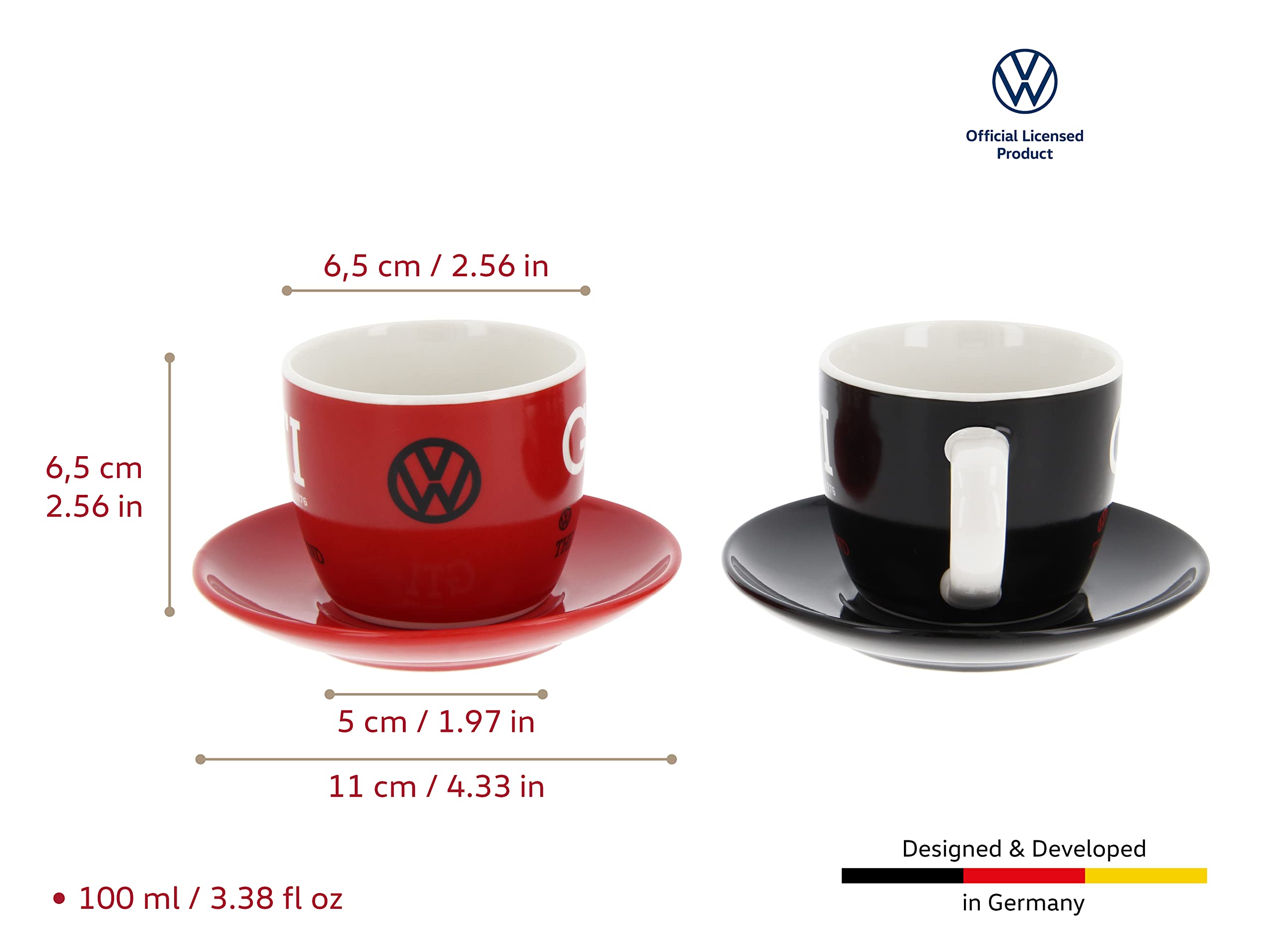 - GTI THE LEGEND/RED & BLACK: The 2piece set with saucers is adorned with the text "GTI THE LEGEND since 1976". Dimensions: h= 6.5 cm (2.6 inches), Ø = 6.5 cm (2.6 inches), volume = 100 ml (3.4 fl oz).