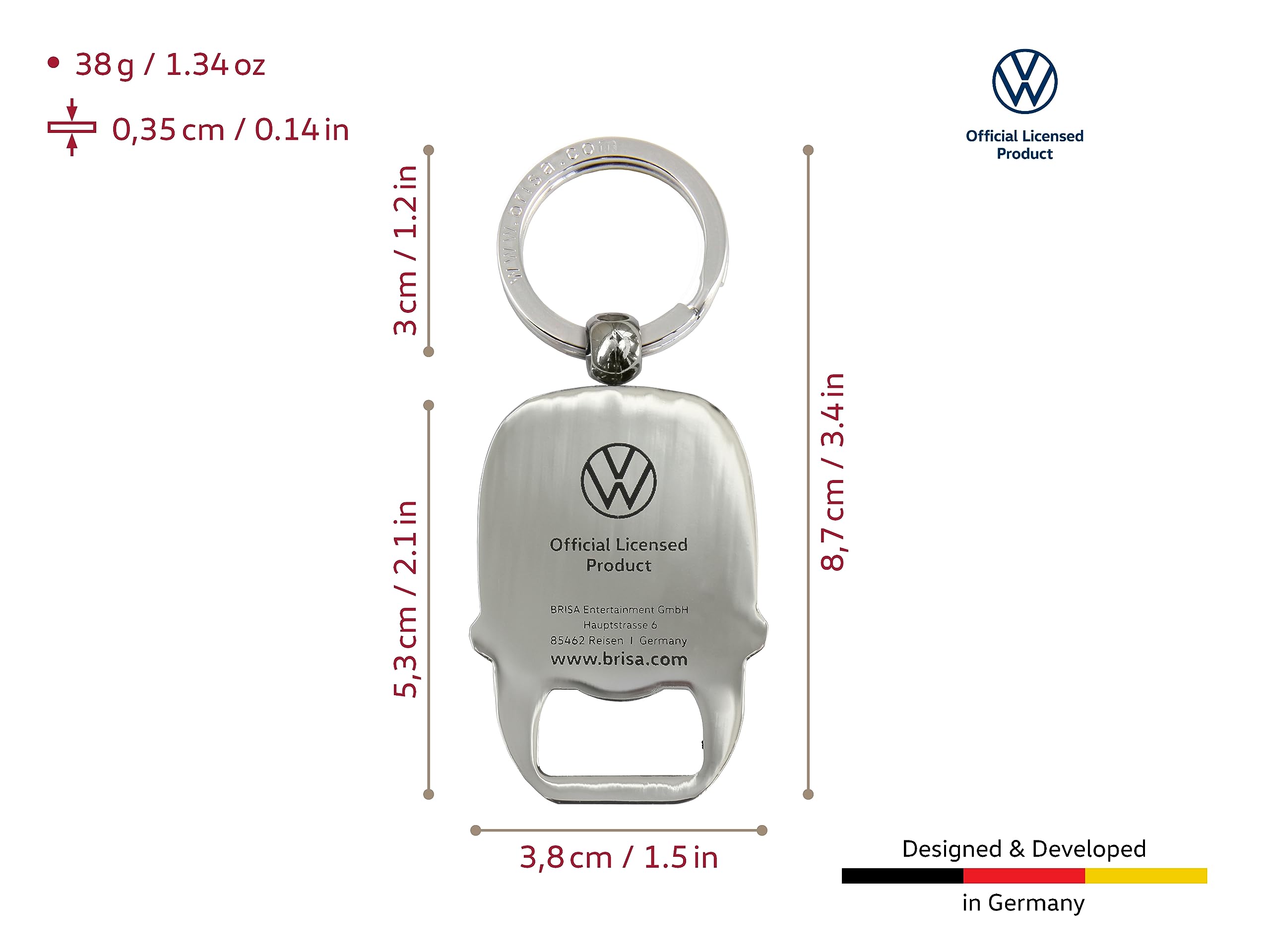 - T1 Bus: This iconic VW T1 Bus keychain with a bottle opener has silver details and the inscription "VW Camper" on the license plate. Dimensions: 4 x 10 x 0.3 cm (1.6 x 3.9 x 0.1 inches).