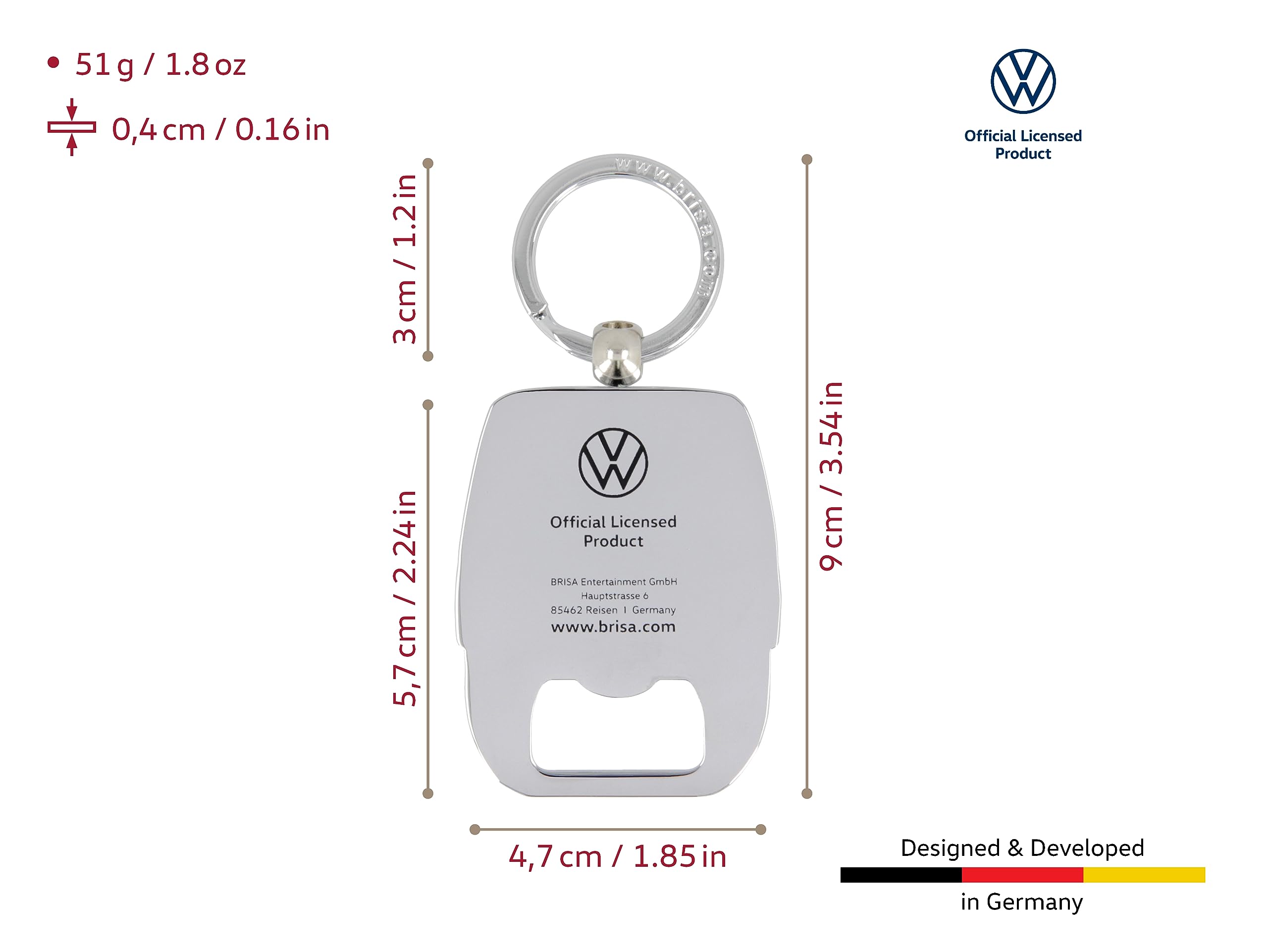 - Bus FRONT RED: The VW T4 Bus keychain with a bottle opener is red, and the license plate is adorned with the silver lettering "VW T4 Bus." Dimensions: 5.8 x 4.5 x 0.4 cm (2.3 x 1.8 x 0.2 inches).