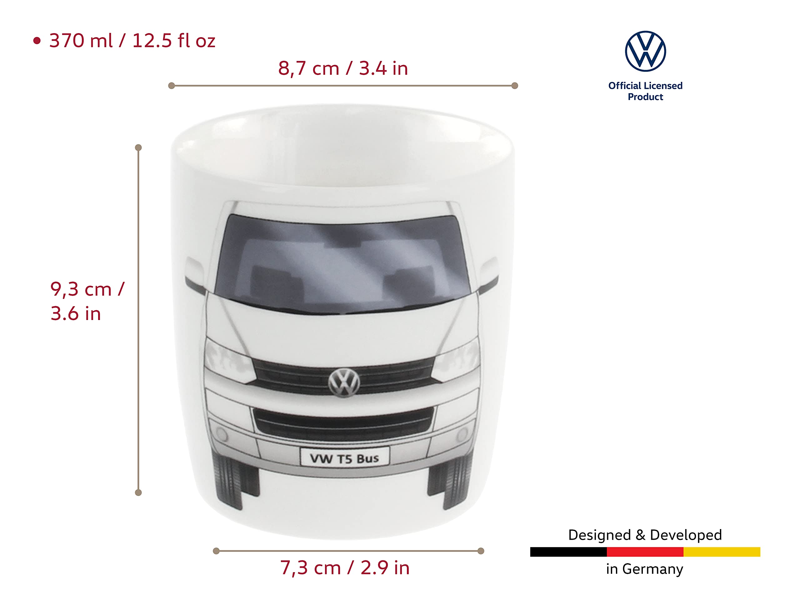- OFFICIALLY LICENSED: The stylish coffee mug in VW T5 Bus design is an officially licensed Volkswagen product. All our items are developed in Germany to meet our high quality standards.