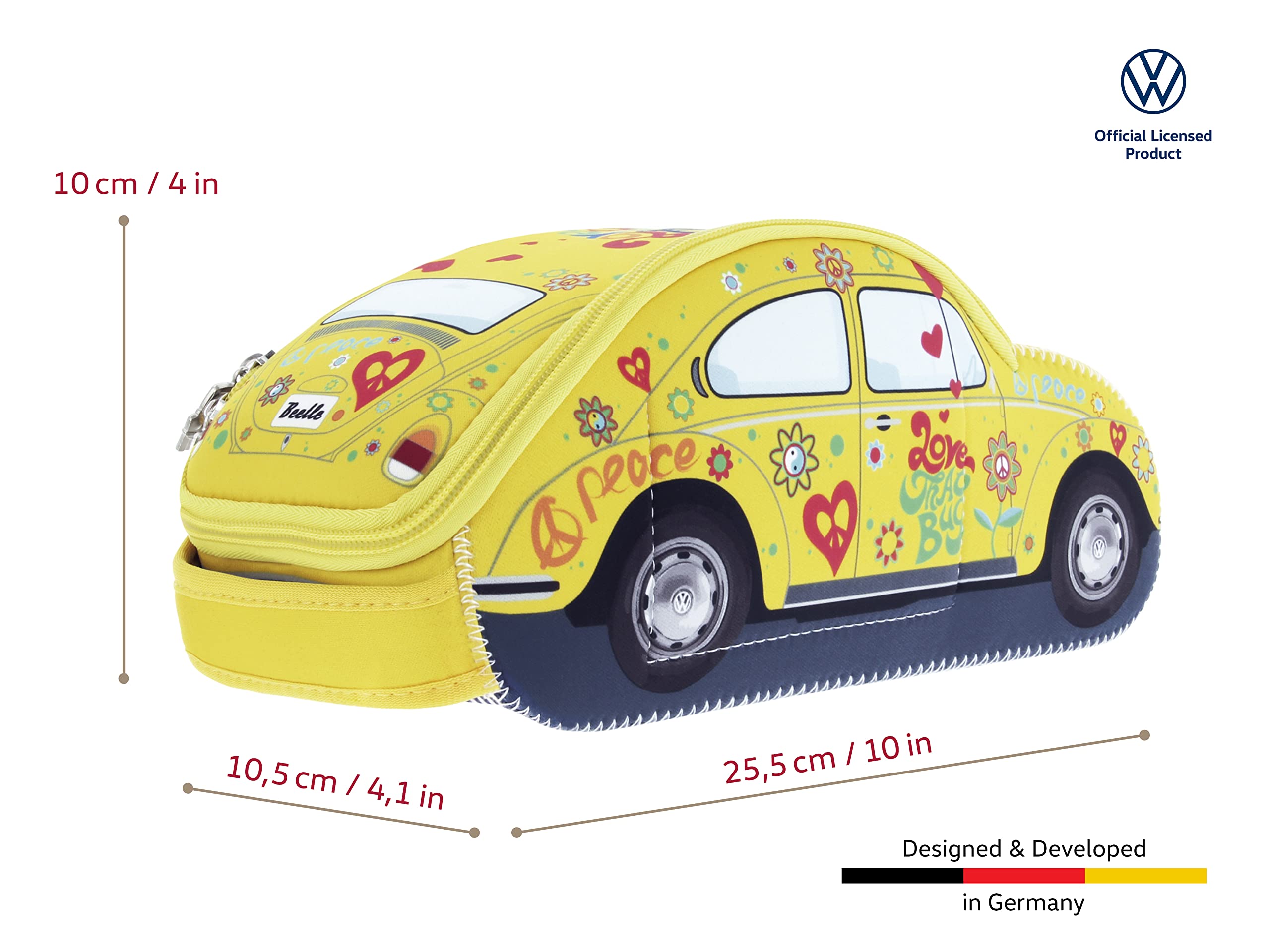 - FLOWER/YELLOW/Small: This Beetle cosmetic bag is adorned with peace signs, flowers, and the "Love that Bug" lettering. Dimensions: 25 x 10 x 10.5 cm (9.8 x 3.9 x 4.1 inches).
